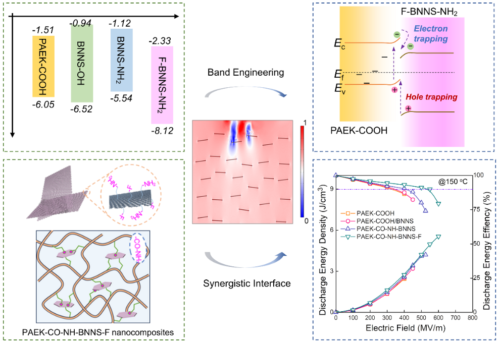 随着电动汽车、可再生能源等领域的快速发展,传统聚合物电介质(如BOPP)的耐温极限(<105℃)已难以满足需求。尽管聚酰亚胺(PI)、聚醚醚酮(PEEK)等材料耐温性优异,但其高温下的传导损耗和介电强度下降等问题长期困扰学术界。如何通过材料设计,在提升界面强度的同时优化能带结构,成为突破高温电容瓶颈的关键。