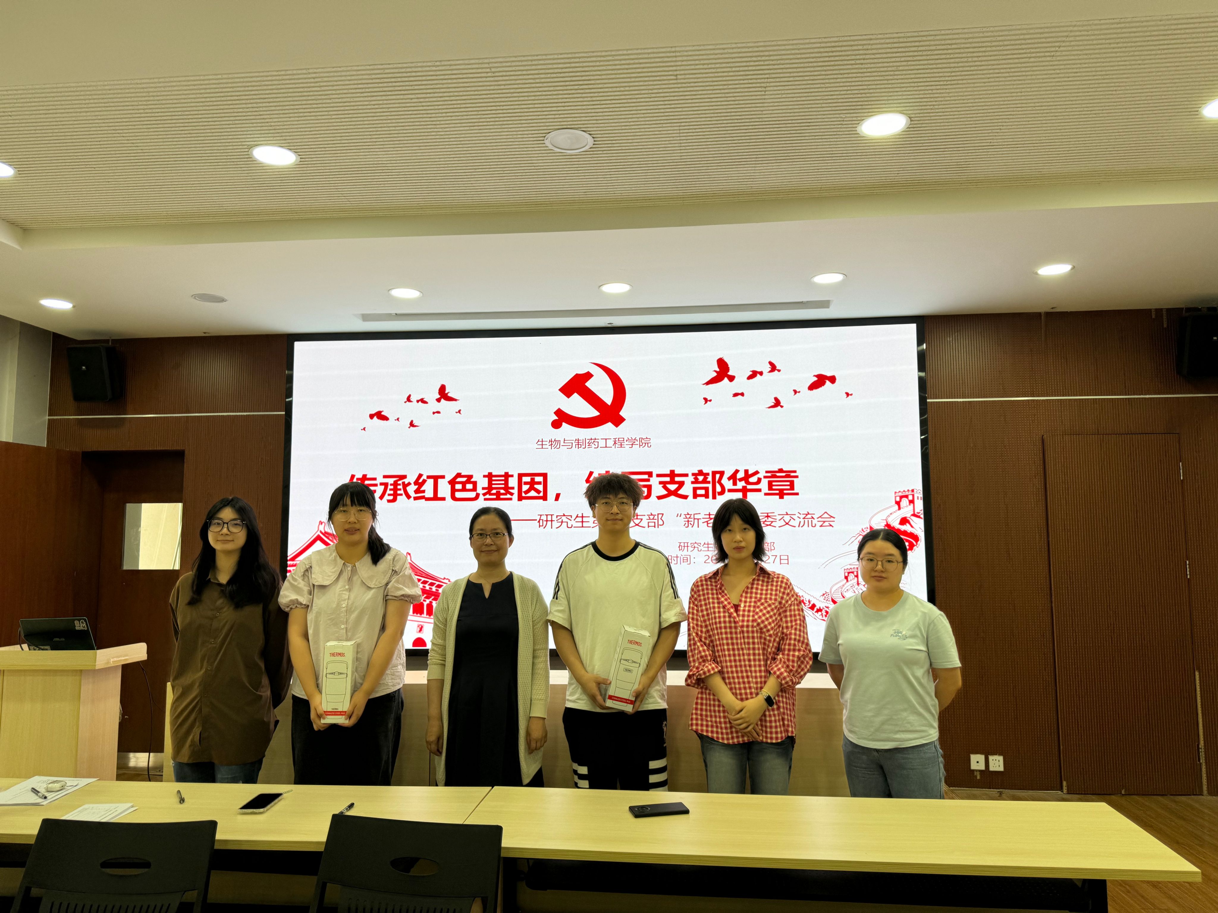 党日活动上,支部书记孙倩为离任支委羊家辉、陆吉洁颁发纪念水杯,寓意"一杯子·一辈子"的党员服务群众宗旨,希望他们将支部经历转化为未来奋斗力量。
