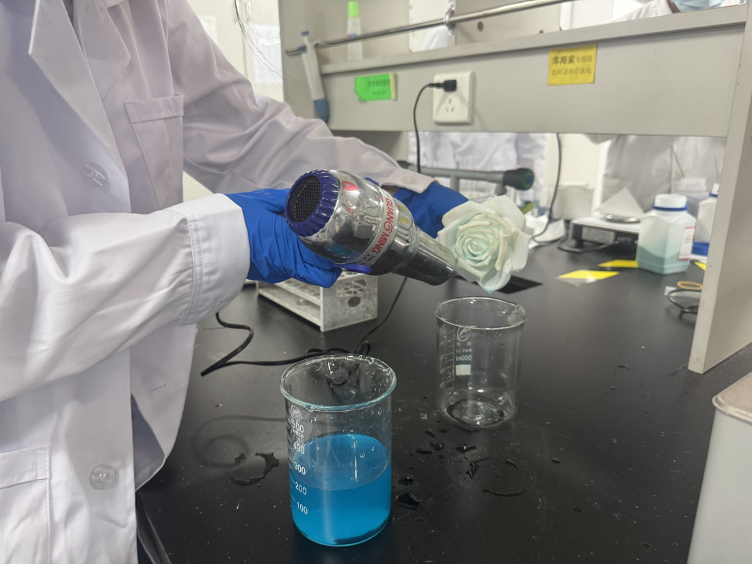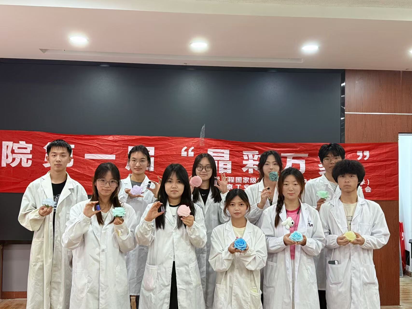 活动现场,生物化学工程国家级实验教学示范中心(威廉希尔williamhill)曾杨老师为同学们详细讲解了“固态彩虹”、“变色玫瑰”、“晶体花”和“流体瓶”制作的化学原理,并播放了规范的操作演示视频。在老师的指导下,同学们纷纷动手实践。他们小心翼翼地调配溶液,观察着溶液在不同条件下的奇妙变化。随着时间的推移,“固态彩虹”在试管内形成七色光带;“变色玫瑰”在酒精灯的灼烧下缓缓绽放;“晶体花”在容器中慢慢凝结,形态各异,晶莹剔透;色彩斑斓的“流体瓶”也在同学们的精心制作下完成,不同密度的液体在瓶中呈现出层次分明、绚丽多彩的景象。