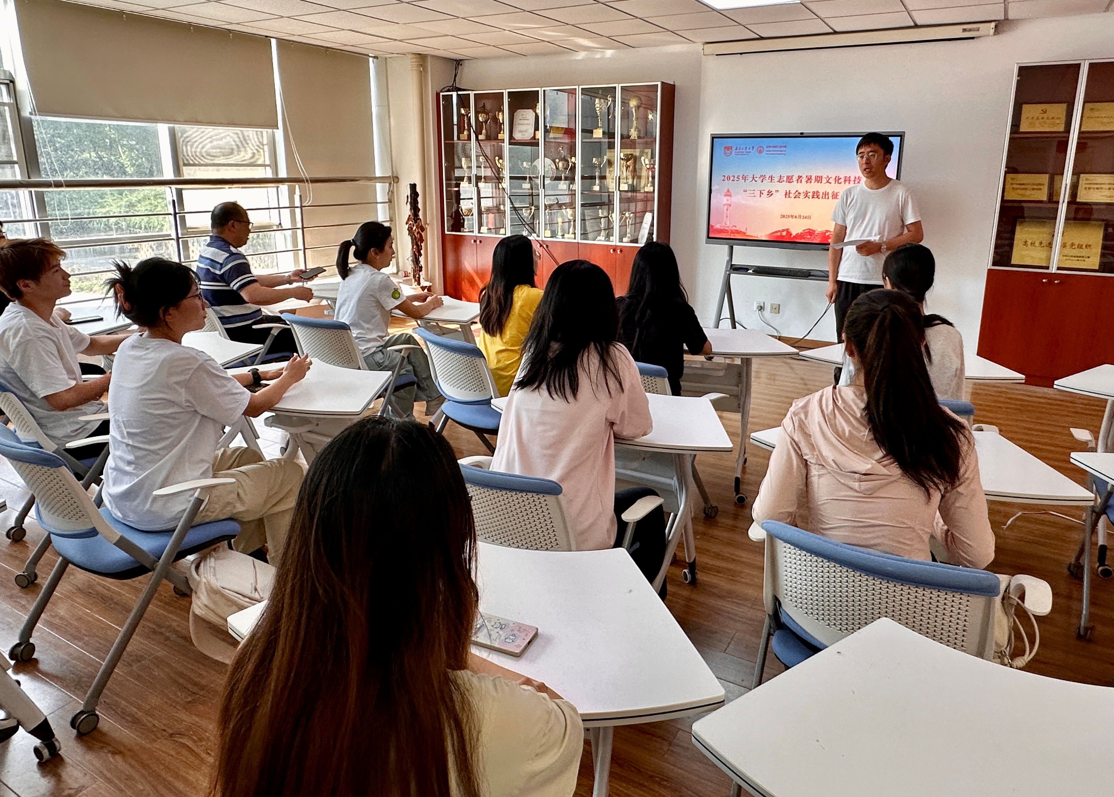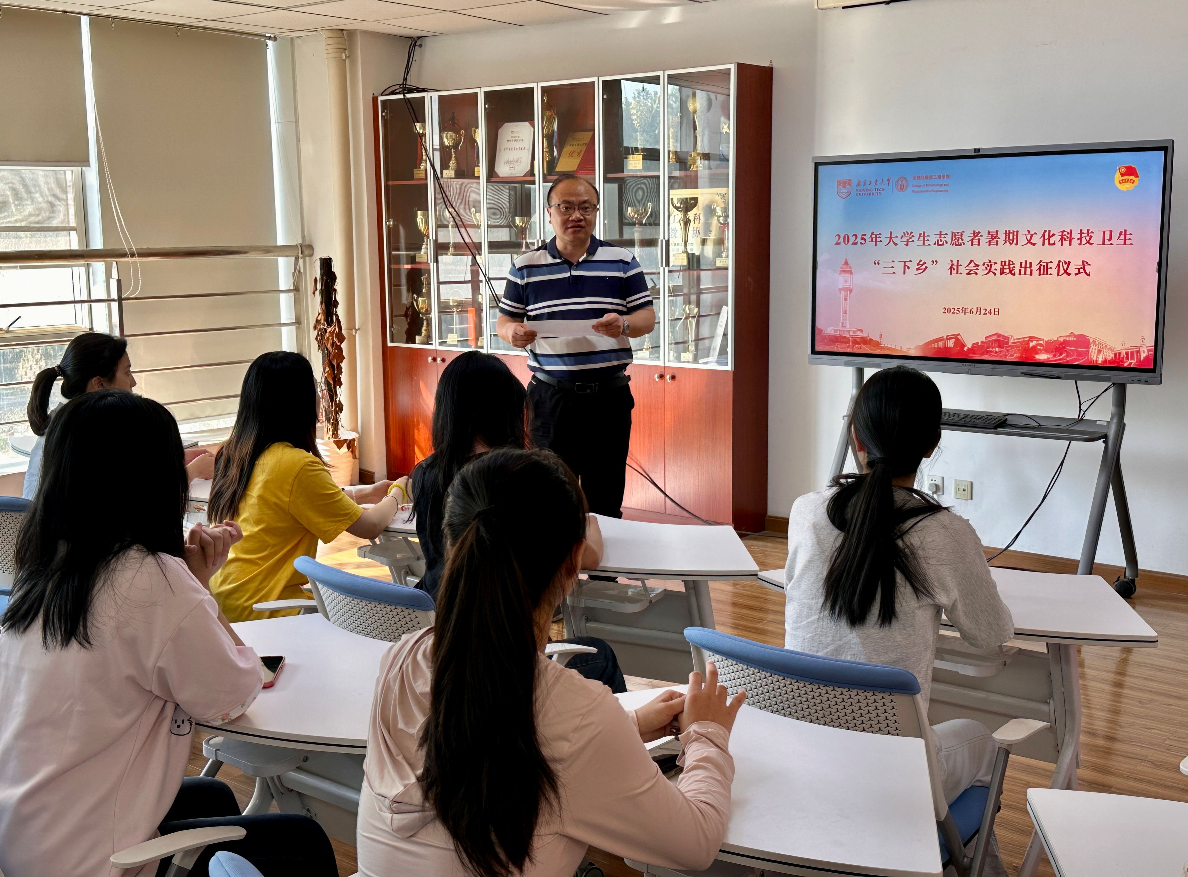 张健老师系统梳理了学院近年来老员工暑期“三下乡”社会实践活动的成效与经验,通报了2025年暑期社会实践活动的学院立项情况。他勉励全体队员要立足新工科建设前沿和国家发展所需,强化数字赋能与实践创新,主动思考、深入调研,在推进中国式现代化的生动实践中贡献青春智慧,高质量地完成暑期社会实践。
