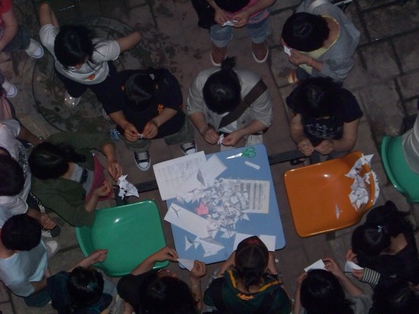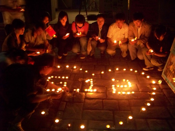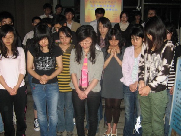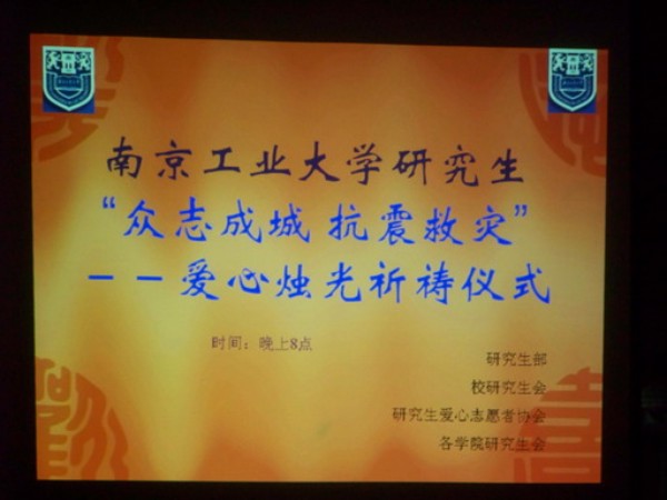 虽然远在震区外的我们不能亲临灾区救灾,但我们可以在心底默默地为他们祈福 !5月18日晚20:00,“爱心烛光祈祷仪式”在丁家桥校区新研楼下正式开始,来自四川绵阳的陈震,成都的李晴,重庆的李新华等同学作为四川籍在校研究生的代表,受邀来到现场。他们表示:身在异地,心系家乡,要与受灾的父老乡亲共同努力,渡过难关,加油,四川!加油,中国!伴随着《祈祷》阴郁而悲痛的旋律声,来自各个学院的研究生们及一些校教职工自觉的守护在心形烛光周围,为受灾的同胞祈福,为死难者默哀。心形烛光的中间是用蜡烛拼成的受难日期“5.12”醒目的数字,表示我们将永远牢记得这一天,记住灾难,记住全国上下众志成城的力量。另外,一串串千纸鹤寄托着我们无限的哀思,我们希望借此能为远方的灾民们送去我们最真挚的祝福。在短暂的祈福仪式之后我们摆放了一些灾区的图片,使同学们了解最新的救灾情况。看到那些感人的场景,有些同学不禁潸然泪下,纷纷自发的进行募捐活动。