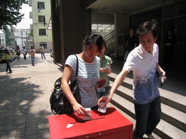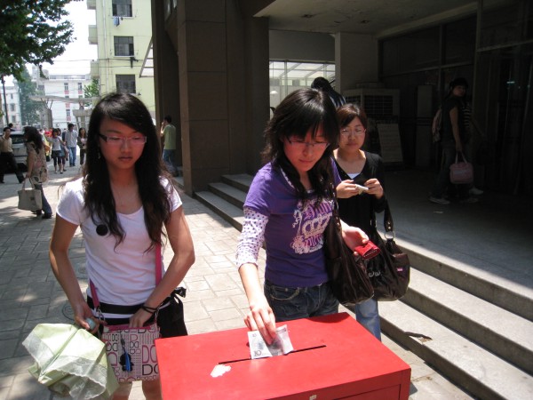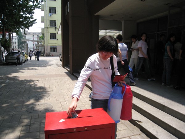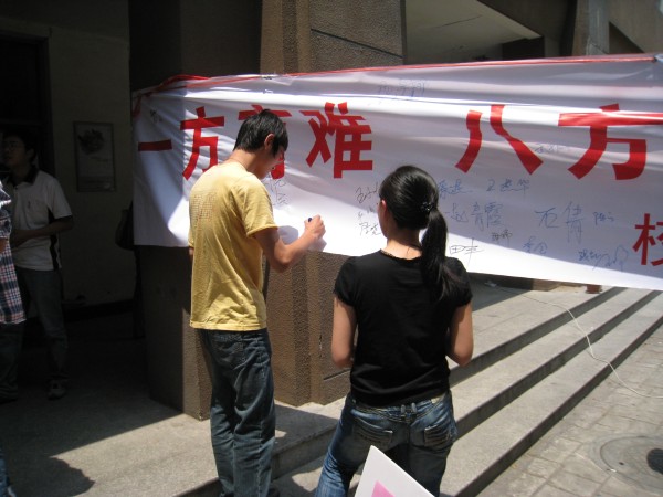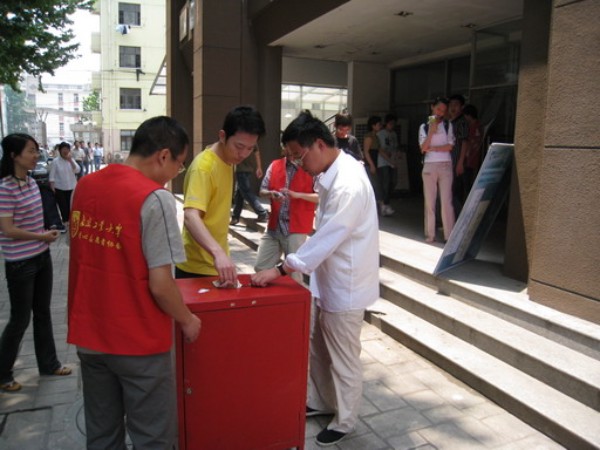 5月19日上午11:00开始,研究生募捐交结仪式在丁家桥校区新研楼下举行。各个学院的募款负责人分别把所在学院的善款汇总,装入信封,投入到我们的爱心募捐箱中。来往的同学和老师也纷纷再次募款,并在“一方有难,八方支援—为四川灾区捐款献爱心”的横幅上留下对灾区人民的祝福签名。更有一些热心的同学询问是否可以捐献奶粉、压缩饼干等物品;当听说四川的AB血型告急后,也纷纷前来询问是否可以献血。我们每一位工大人都心系灾区,关怀灾区,“只要人人都献出一点爱,这世界将变成美好的人间”。短短一个多小时,经工作人员仔细清点,募捐箱中共征得善款39787.1元。至此,此次爱心活动圆满结束,可是我们的爱心仍会继续,当祖国需要我们的时候,我们一定会站出来,为国家做出自己的贡献。