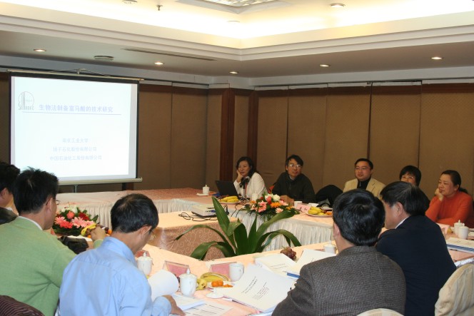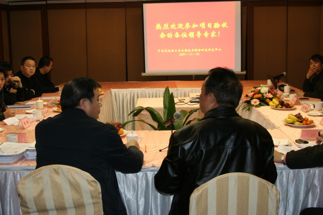 中石化南京工业生物技术联合研究开发中心项目验收会,于2007年11月30日上午在南京凤凰台饭店六楼会议厅举行。项目验收专家组成员共九人,由中石化科技开发部王玉庆副主任任组长,中石化科技开发部化纤处庄毅处长任副组长,其他专家来自南京林业大学、扬子石化、中石化抚研院、上海工程公司和四川维尼纶厂等单位。董事长欧阳平凯院士代表学校对出席验收会的专家表示热烈欢迎,并介绍了生物化工学科在国内高校中的地位和取得的重要成果。黄和教授、何冰芳教授、姜岷副教授和李霜博士分别就“生物乙烯生产的技术研究”、“乳酸发酵及聚乳酸技术研究”和“生物法制备C4二酸的研究”等三个项目作了结题工作汇报。