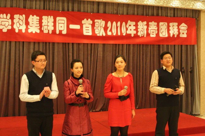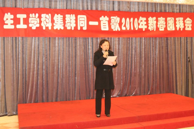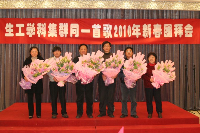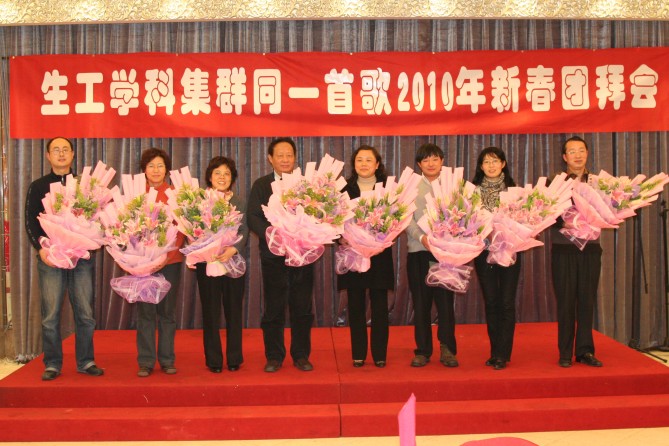 新春团拜会由公司党委书记缪昌美同志主持。经理韦萍教授宣读2009年十大新闻;国家生化中心常务副主任应汉杰教授介绍生工学科集群教师科研到款情况。工作人员手捧鲜花向国家教学成果二等奖获得者韦萍、欧阳平凯、应汉杰、徐虹、黄和、胡永红、周华、何冰芳、曹飞等9位老师,以及2009年科研到款200万以上的应汉杰、黄和、欧阳平凯、朱建良、洪厚胜、熊晓辉、韦萍、柏建新等8位教师致贺,表示心中的礼赞。