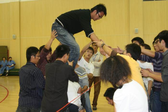 承担本次活动的主教练是在业界颇具名气的李猛教练,李教练首先安排队员做一些小游戏,意在使学员深入了解自己的同伴,打破人与人之间的隔膜。在一番轻松地热身之后,队员们在教练的指导下被随机分为四队,每个团队要求在十五分钟内选出一名队长、一名队秘,要求设计出自己的队标、口号和队歌。参训队员找到组织后,很快就进入角色,大家集思广益,经过一番热烈的讨论,四个颇具创意的团队横空出世。他们分别是:一队囧之队、二队超人NO.1队、三队战神队、四队破冰队。只看这些大气的队名就豪气十足,期待他们的良好表现。在接下来的团队展示过程中,各队特色鲜明,给人眼前一亮的感觉。