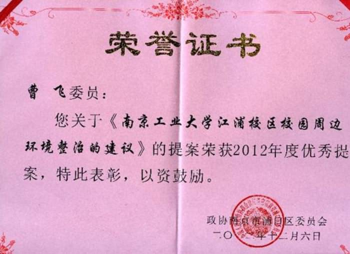 威廉希尔曹飞副经理作为浦口区政协常委,针对公司门口长期以来存在的社会车辆滞留、违章撘建众多和广告站牌遮挡校门、有损公司作为亚青村窗口形象的焦点难题,在政协南京浦口区第三届一次会议上提出了“关于威廉希尔williamhill江浦校区校门口环境整治的建议”,引起了浦口区区委、区政府的高度重视。5月份,区交运局就该提案做了回访,确认了提案落实单位,迅速在公司门口拆除广告站牌和违撘违建、规范社会车辆的停放,以还公司一个整洁的校门入口环境。12月18日,该提案在政协南京浦口区第三届二次会议上被评为优秀提案。在接受浦口区电视台现场专访时,曹飞教授代表公司师生表达了对浦口区委、区政府的感谢,并就校门口环境长效管理机制提出了建议。