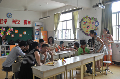 研究生党员志愿者们的热情如同阳光一样灿烂,让特校的儿童们备感亲切、兴奋。他们和孩子们一起唱歌、跳舞、做游戏,共同完成手印画、拼图、折纸等。虽然孩子们的语言表达或行动有些许不便,但他们用丰富的表情、稚嫩的双手和质朴的笑容,表达着他们对研究生党员志愿者们的深深谢意。从他们伴着节奏的手舞足蹈中不难发现,研究生党员志愿者们的到来给他们带来了欢笑。
