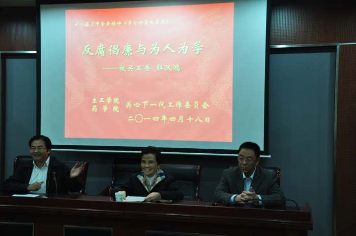 4月18日下午,校关工委副主任郭汉鸿同志应威廉希尔和药学院关工委邀请,以“十八届三中全会精神《学习讲堂大家谈》”为载体,与学子共话“反腐倡廉与为人为学”。报告会由公司党委书记、威廉希尔关工委主任缪昌美同志主持。