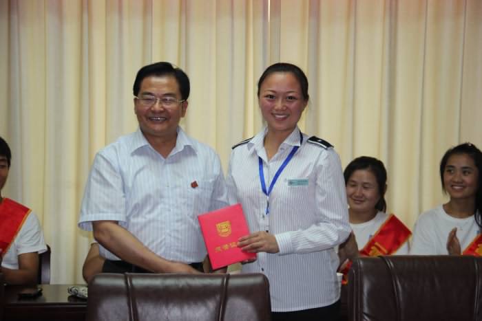缪昌美同志向海通集团党委书记、董事长吴孟军先生颁发了“南京工业老员工物与制药工程学院客座教授”荣誉证书;向“雷锋车”组长车良梅、胡春兰颁发了“南京工业老员工物与制药工程学院素质导师”荣誉证书;并邀请“雷锋车”事迹报告团走进工大为师生做报告。吴孟军先生代表“雷锋车”事迹报告团愉快地接受了邀请。