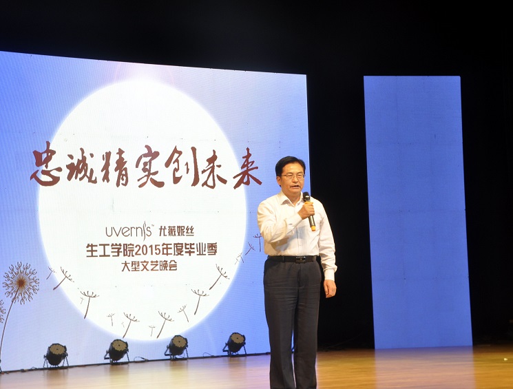 缪昌美老师在热烈的掌声中应邀为“忠诚精实创未来”2015届毕业晚会致辞。他在致辞中以美好的心情祝贺2015届毕业生圆满完成学业;感谢教书育人的老师;感谢友情赞助晚会的南京轩凯生物科技有限公司和南京诺尔曼生物技术有限公司。他感于毕业惜别之情,特将“忠诚精实”诠释为“忠于祖国志存高远,诚毅担当敬业奉献,精益求精创新创优,实干兴邦建功立业”,期待同学们爱国荣校写青春,忠诚精实创未来,拥有美丽的人生和美好的未来。