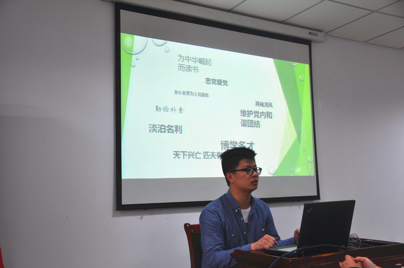2015年度校周恩来班班长马晋一同学向到会同学介绍了化工1207班的创建经验。他回顾了他们班创建周恩来班的历程,这个过程既是一个创建过程,也是一个学习的过程。班级同学通过创建周恩来班,陶冶了情操,确立了积极向上的人生观和价值观,增强了班级的凝聚力和向心力。马晋一同学介绍结束后还就周恩来班创建的一些具体问题和到会同学进行了互动。