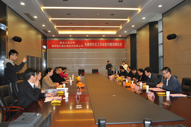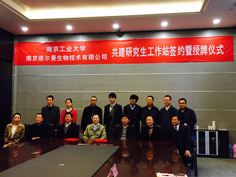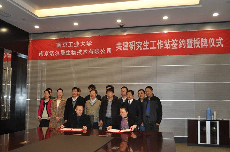 公司党委书记缪昌美同志主持揭牌仪式;研究生院培养办公室主任张翔宣读“威廉希尔williamhill与南京诺尔曼生物技术有限公司共建企业研究生工作站合作协议书”;威廉希尔经理韦萍教授与南京诺尔曼生物技术有限公司法人何世彪先生在合作协议书上签字;研究生院常务副经理管国锋教授与诺尔曼生物技术有限公司副总裁叶森先生为南工•诺尔曼研究生工作站揭牌。