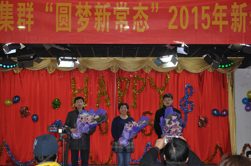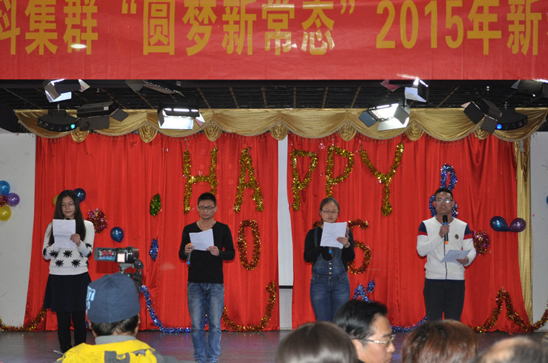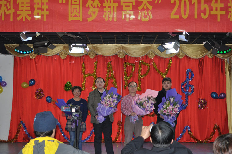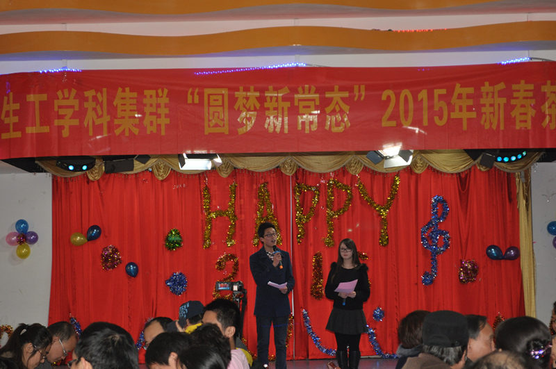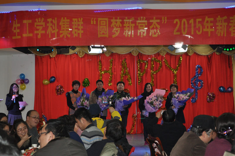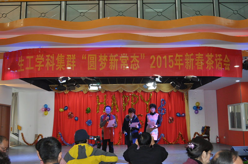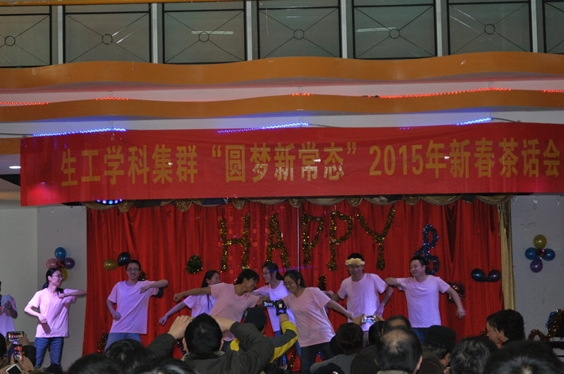 茶话会上,生工学科集群师生悉心准备的联欢节目让现场充满了欢声笑语。创新中心老师们的歌舞《桃花朵朵开》,尽显生工学科集群老师的青春与活力;实验中心老师们的对唱《风吹麦浪》以他们自己录制的MV为背景,颇为感人温馨;生工学科集群研究生会选送的自创朗诵《远航》,展示了生工学子志存高远、脚踏实地的精神面貌;独舞《雨竹林》让大家领略了民族舞独特的魅力;生物工程系的合唱《阳光总在风雨后》,传递出经历风雨仍怀希望的豁达;生工中心老师们的小合唱《我的好兄弟》展示了共勉同乐的情谊;药学院老师们合唱的《相亲相爱一家人》,传递出生工学科集群像一个大家庭一样温暖;由两位研究生十佳歌手合唱的《因为爱情》,用歌声打动人心;由三院学办老师合作的舞蹈《小鸡小鸡》,欢快的旋律将茶话会的欢乐气氛推向了高潮;轻化老师们的合唱《明天会更好》,为大家送上了新的一年的祝福。由欧阳平凯院士和生工学科集群领导班子成员合唱的《同一首歌》,让整个会场沉浸在“万马奔腾辞旧岁,三阳开泰迎新春”的意境中,生动地展现了生工学科集群积极适应和引领新常态的自觉和自信。
