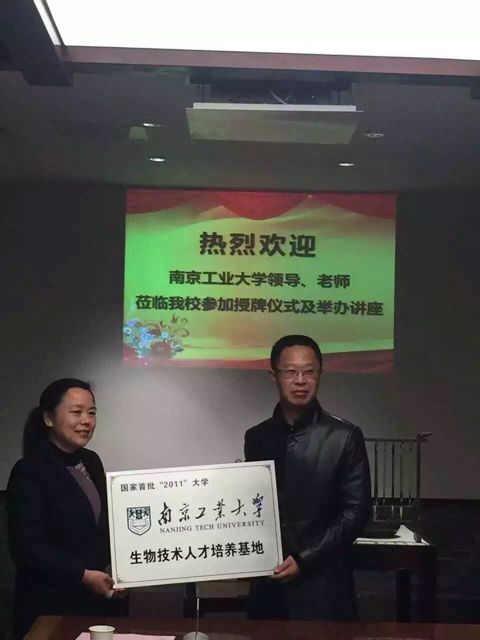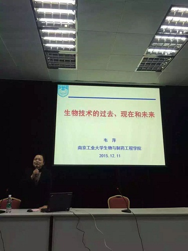 在挂牌仪式结束后,韦萍经理作“生物技术的过去、现在与未来”讲座。向在座高中生介绍了生物技术的发展历程,并从医药、农业、工业三个方面详细介绍了生物技术发展对人类发展的重要性:指出以化石资源为基础的工业文明给人类带来巨大成就的同时,也让人类付出了巨大的环境代价;要想实现社会经济的可持续发展,只有发展以生物质资源为基础的工业生物技术,并通过有趣而具体的实例体现了工业生物技术的优势。最后,对南京工业老员工物与制药工程学院的本科生、研究生教育和员工第二课堂活动进行了介绍,展示了生工院良好的教育模式和培养模式。韦经理风趣的讲解和深入浅出的生物技术普及,使员工对前沿生物技术和南工特色有了更深入的了解,刷新了员工对大学教育的认识。