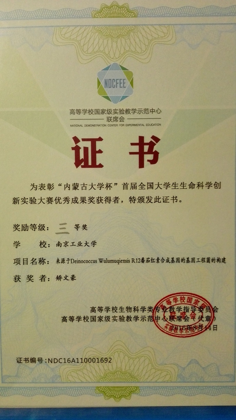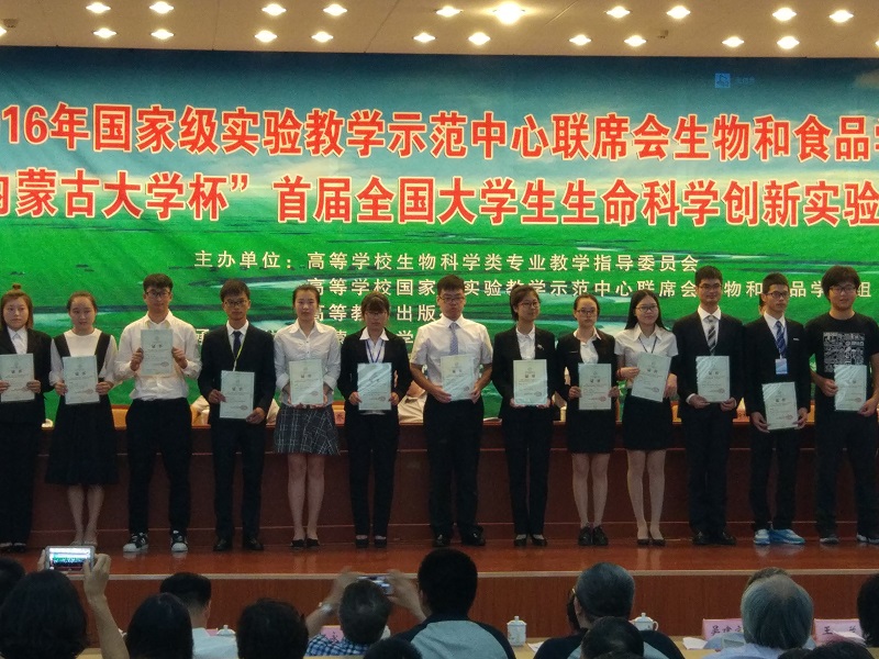 本次大赛由高等学校生物科学类专业教学指导委员会、国家级实验教学示范中心联席会联合主办,由内蒙古大学、吉林省生物化学与分子生物学会联合承办。大赛共吸引来自南京大学、天津大学等全国51所高校的85支项目团队参赛。公司威廉希尔2013级员工矫文豪和2015级员工陶浩然小组凭借作品“来源于Deinococcus wulumuqiensis R12番茄红素合成基因的基因工程菌构建”入围决赛。