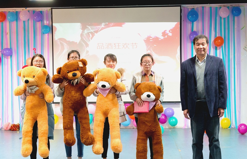 缪教授进行开场致词,表明酿酒大师是一个有意义的活动,希望同学们从过程中了解葡萄文化,提高创新精神。参赛同学一一介绍自己作品的思想和创新点,评委老师们依次品酒并点评各组作品。期间龙爷爷热情朗诵"将进酒",引爆全场。同学们在此次活动中边品酒边欣赏表演,活动中穿插抽奖环节,现场氛围热烈。最后由缪教授、张老师、龙爷爷为此次酿酒大师的获奖人员颁奖。