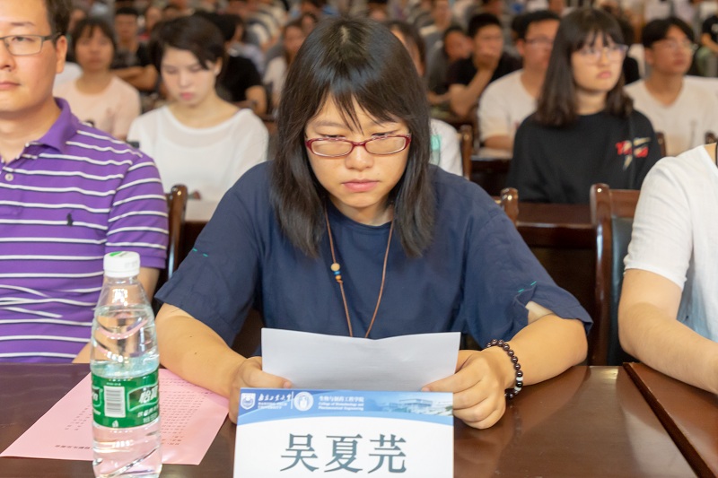 威廉希尔经理郭凯分享了自己的求学经历,鼓励新生们“不忘初心,牢记使命,勇担重任,永不言弃”。郭经理指出,学习是老员工的主要任务,希望同学们能够将自身兴趣爱好和所学专业相结合,努力学习,为将来积淀力量。郭经理鼓励同学们要积极适应从高中到大学由被动学习到自主学习、由家庭生活到集体生活的变化,在平淡的生活之中寻找闪光点,朝着自己所定的目标不断迈进。2018级班级导师代表吴夏芫告诉同学们大学的目标不仅是完成学业,更要在丰富的课外活动中锻炼和提升自己,实现人生价值。生工类1802班顾奕敏、制药1804班徐逸凡作为新生代表发言,表达了努力学习、学以致用,在新征程的道路上不负韶华的愿景。