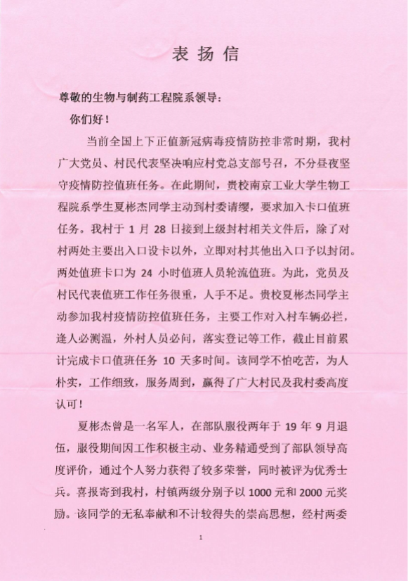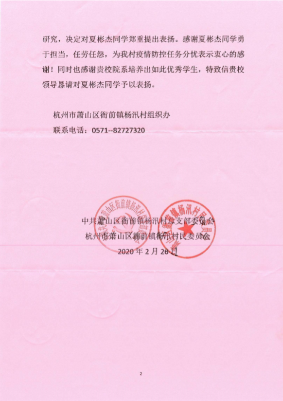 近日,公司党委收到杭州市萧山区衙前镇杨汛村村两委寄来的表扬信,感谢公司生物工程专业生工类1902班夏彬杰同学为该村疫情防控工作做出的贡献。