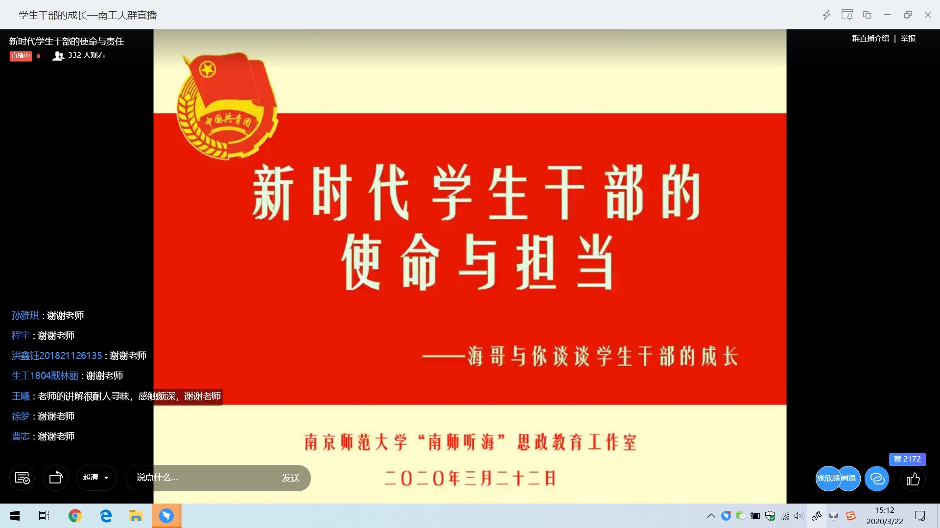 沈晓海老师以“新时代员工干部的使命和担当”为主题,从“什么叫员工干部”“什么是新时代和使命担当”“如何担当新时代赋予的时代使命”三个方面,用贴近员工实际的语言和案例讲授了自己在担任和培养员工干部过程中的心得体会,引起了员工们的强烈共鸣和热烈反响。讲座最后,同学们与沈老师积极互动。同学们听完线上讲座后表示,从“面对面的报告”到“屏对屏的交流”,平台变了,思想没变,活动接地气、有干货、受教育。