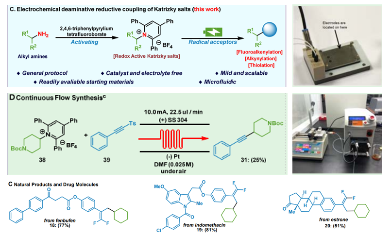 电化学合成具有绿色、环保、可持续等优势,与传统的有机反应不同,电化学合成可使用电子和电子空穴取代化学氧化剂或还原剂。微流场技术通过微尺度效应,可数量级地提升电解性能和电化学反应效率。科研团队通过电化学与微流场技术耦合,高效实现了新型还原脱氨交叉偶联过程,不需添加催化剂或者电解质,且反应效率与应用性大幅优于传统的电化学过程。该方法不仅适用于氟烯基化、炔基化和硫醇化等反应体系,还可以应用于药物活性分子的修饰,如芬布芬、吲哚美辛和雌酚酮等。整体而言,该方法具有反应条件温和、底物适用性好、安全可靠、容易规模放大等优势,显著提高了原子经济性,减少石化资源的消耗,为“双碳”战略发展提供了新的技术方案,在生物活性分子骨架构建、药物合成等领域具备良好的潜在应用价值。郭凯教授和南京大学王毅副教授、倪升阳博士为共同通讯作者。