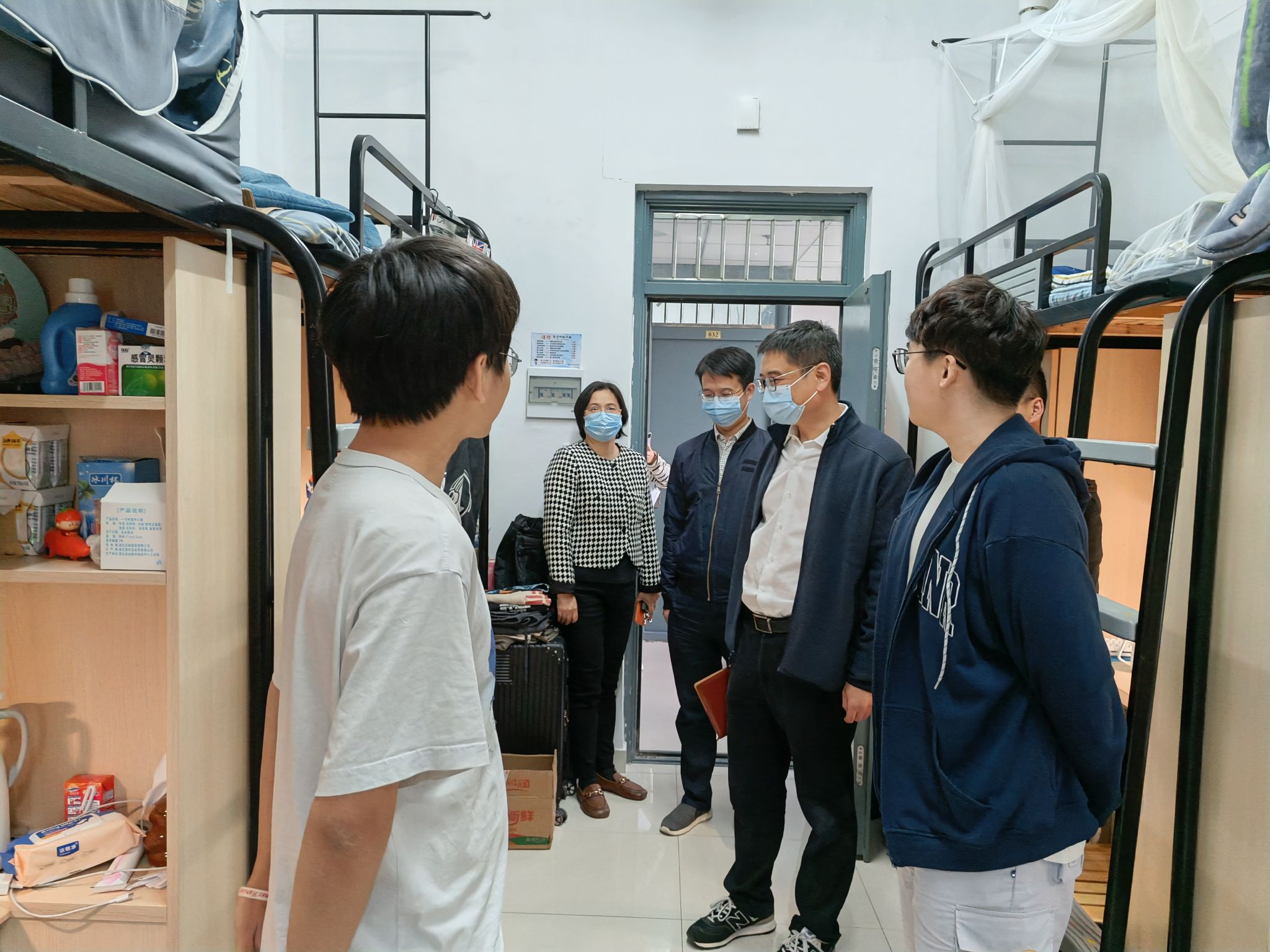 郭凯副董事长带领生工学科群有关学院员工工作负责人、辅导员深入员工宿舍,检查线上上课情况,并详细询问了同学们当前学习、生活上的困难。