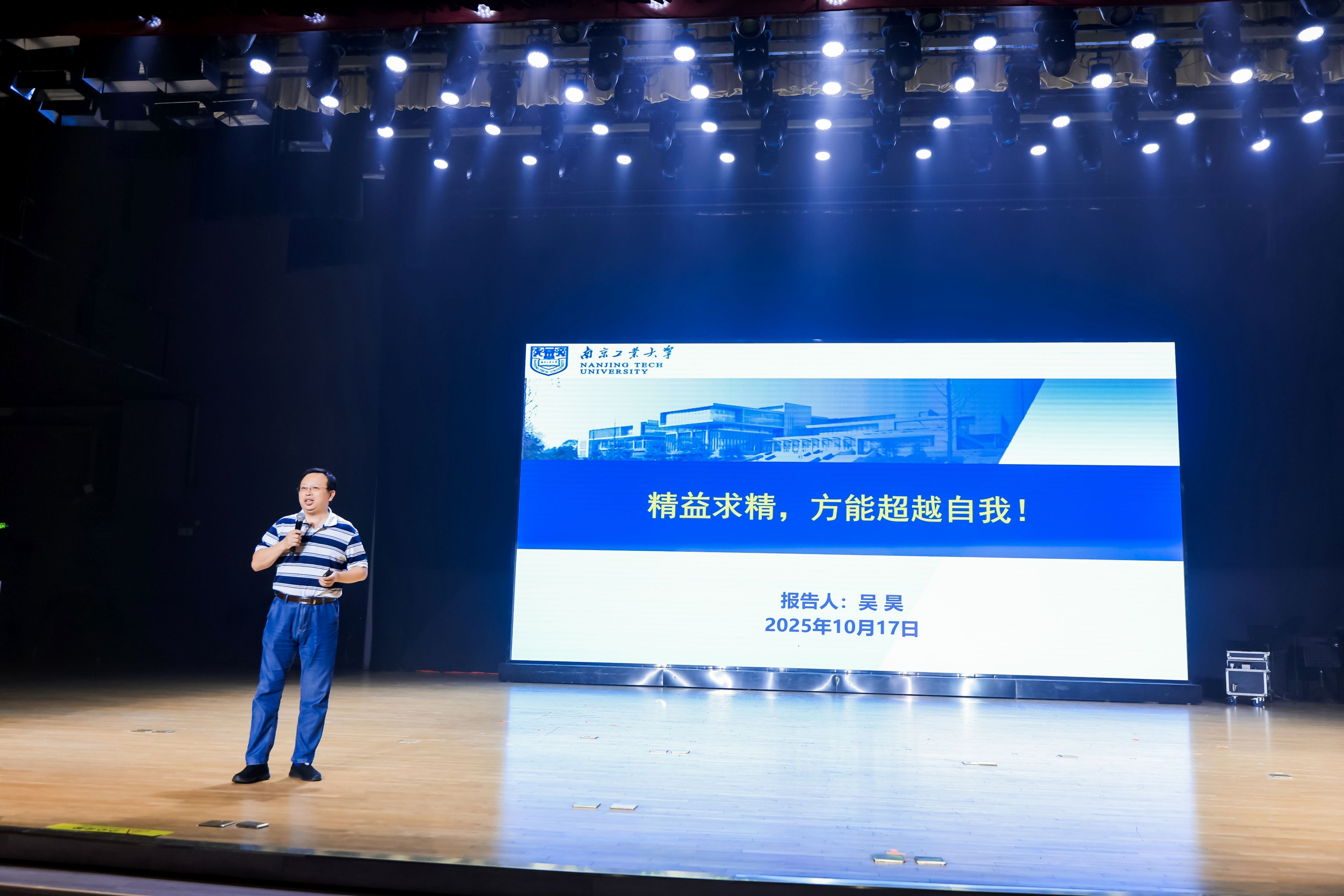随着开场舞《爱的主打歌》动感起舞,现场氛围瞬间被点燃。缪昌美老师深情希望同学们以“忠”为笔书写壮丽的青春华章;李振江教授分享师生以诚相待双向奔赴的教育初心;吴昊教授回忆深耕教学一线“精益求精”的执着与坚守;南京生命原健康科技总经理唐成伦员工结合创业历程解读“实干”真谛。反诈短剧《欲望的“贷”价》与歌曲《铭记》的演绎传递责任担当与青春热血。演出全程脉络清晰、亮点迭起,于声色光影间传递精神力量。