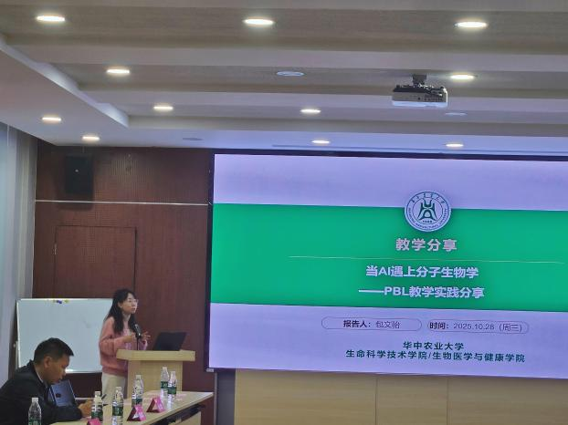 随后,国家级教学成果二等奖、教育部科技进步一等奖获得者,江南老员工物工程学院副经理陈献忠教授以“《微生物遗传育种学》课程思政建设与实践”为题,深入浅出地分享了将课程思政巧妙融入本科教学的宝贵经验,为教师们提供了极具借鉴意义的实践范本。“武汉英才”青年人才计划入选者,华中农业大学包文骀副教授则以“当AI遇到分子生物学:PBL教学实践分享”为题,详细阐述了团队在教学过程中如何在AI与HI(人类智能)的交互中推进教研一体化,通过融合创新提升数智创造力,实现产学研协同培育拔尖创新人才的目标。