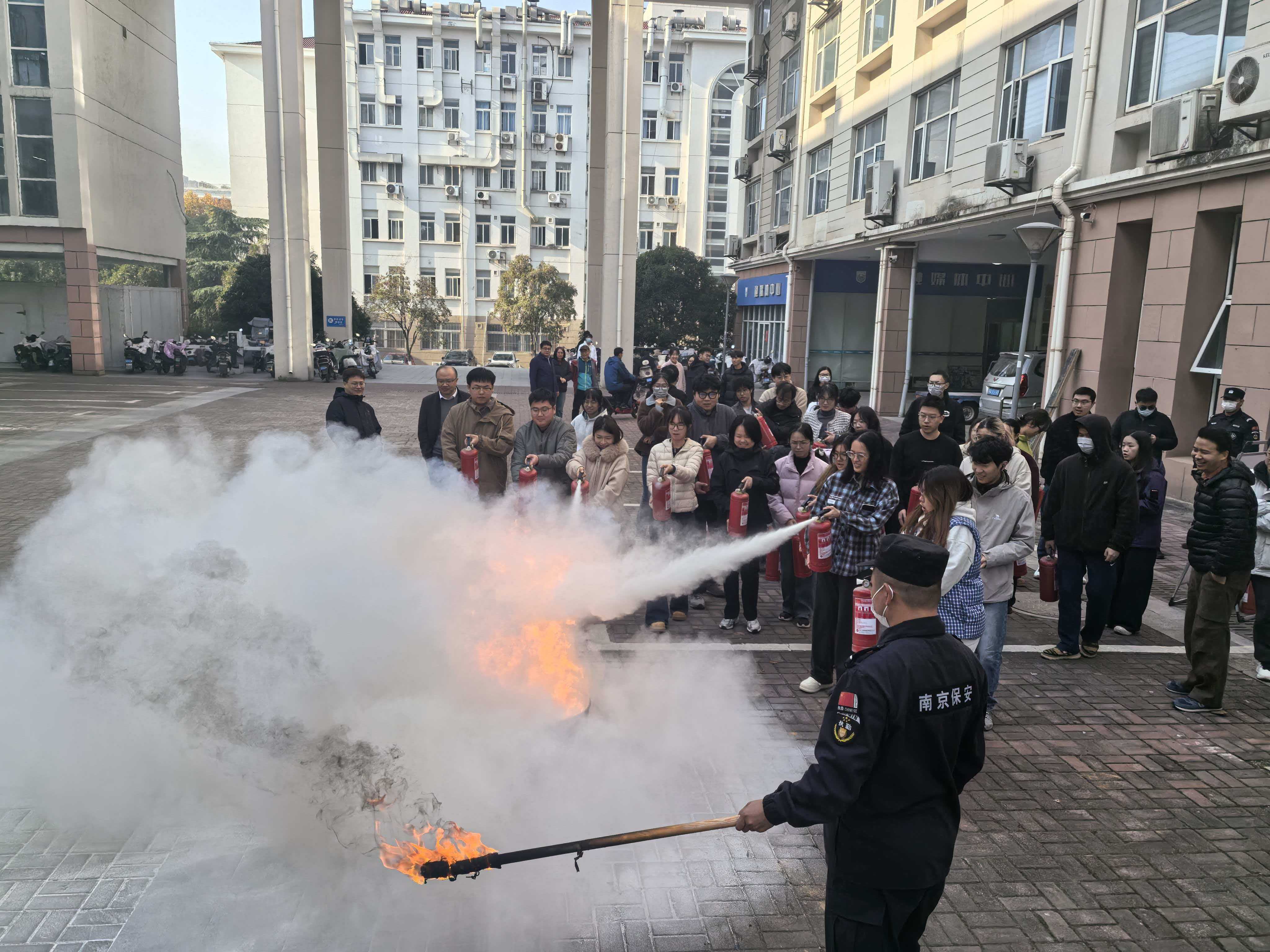 在消防疏散演练中,警报声在消防烟雾冒出时响起,学院近400名师生按预定疏散路线,快速有序地从实验室及办公室快速撤离到了指定安全区域。随后,校保卫处刘世伟老师对疏散演练进行了点评,并给师生宣讲了校园火灾预防、火场逃生及灭火常识等消防知识。培训结束后,在尚德楼A1至A2广场进行了灭火实战演练与操作,组织师生学习了灭火器使用方法及运用技巧,提高了师生的防火知识和技能。